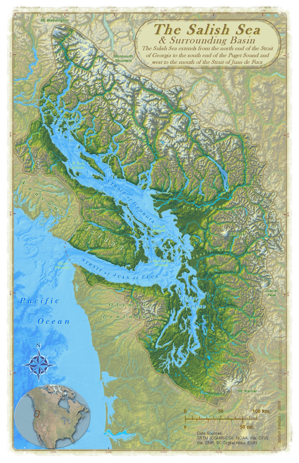 Map of the Salish Sea & Surrounding Basin, Stefan Freelan, WWU, 2009